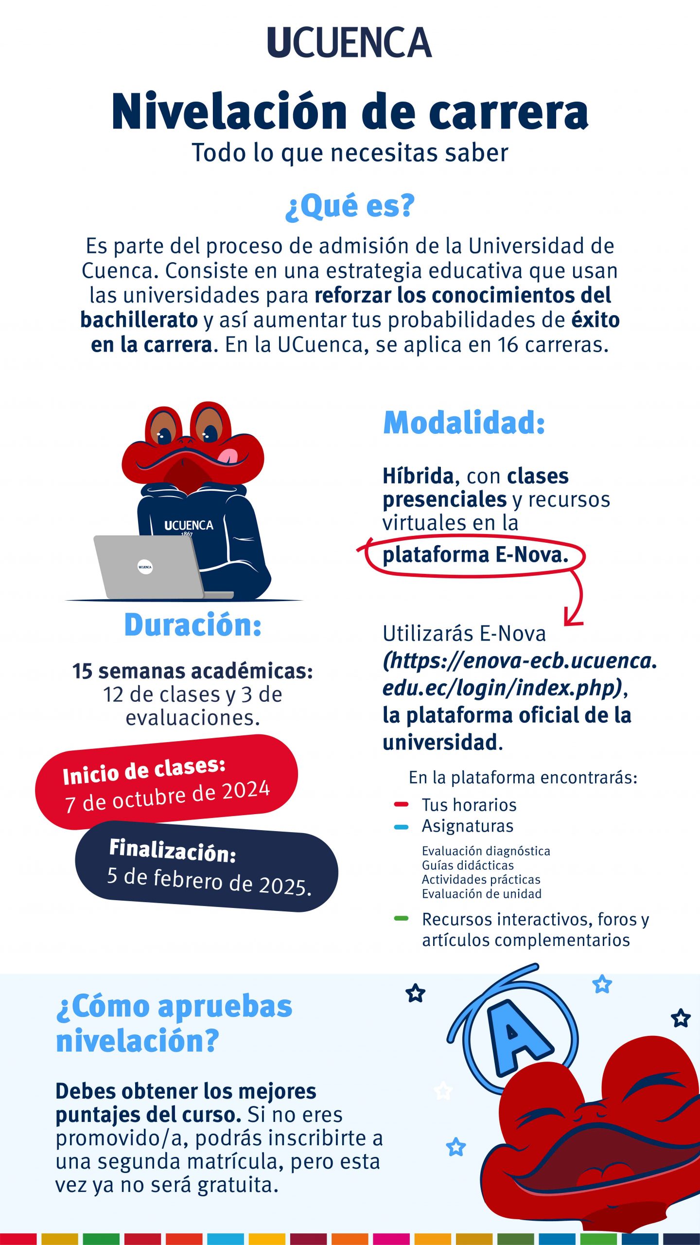 El curso de nivelación de carrera es parte del proceso de admisión de la UCuenca. Consiste en una estrategia educativa que emplean las universidades para equiparar los conocimientos de bachillerato en las y los estudiantes previo al ingreso a su carrera. Busca fortalecer las habilidades que les permitirán enfrentar de mejor manera el desarrollo de su carrera universitaria.