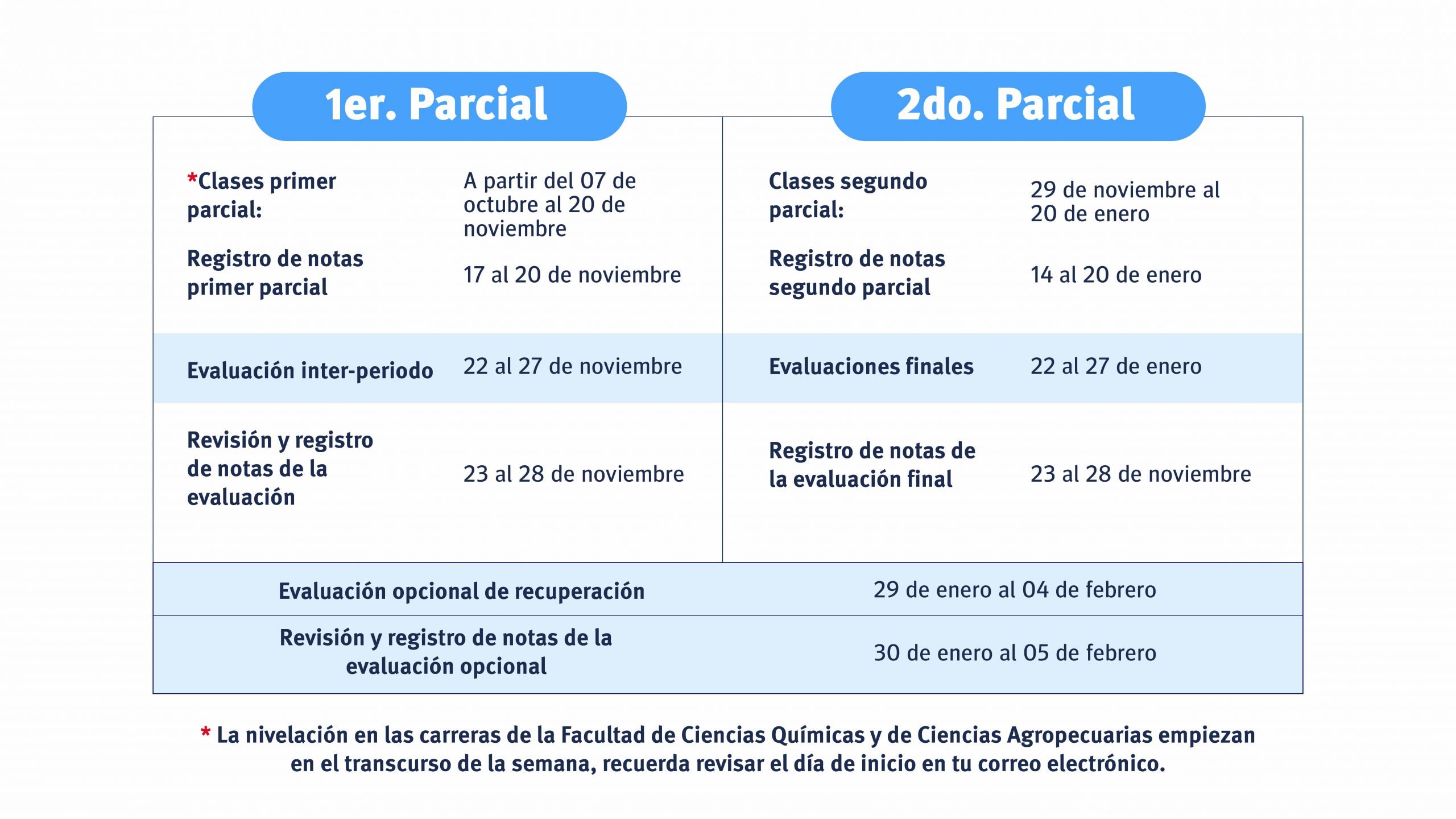 Para el periodo académico septiembre 2024 – febrero 2025, la nivelación se llevará a cabo en 15 semanas académicas presenciales divididas en 12 semanas de clase y 3 de evaluaciones.