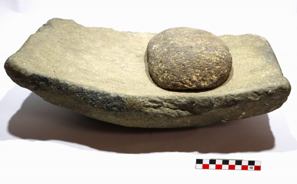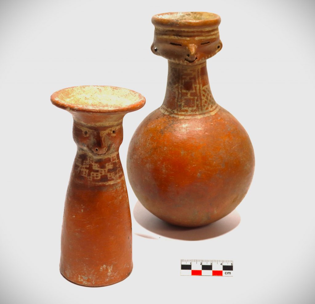 Recipientes cerámicos con rostros humanos (antropomorfos) y piedras de molienda.Crédito: Proyecto Catalogación y puesta en valor de bienes arqueológicos Museo Comunitario Chobshi.