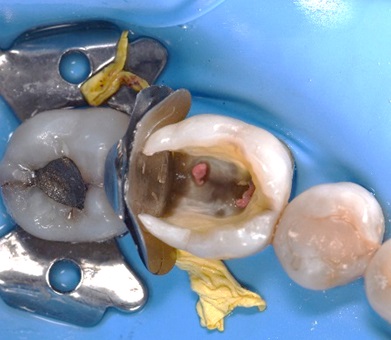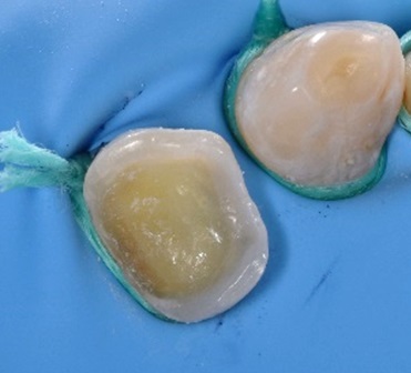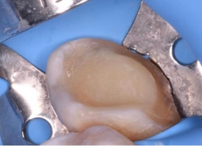 Cuando se cumplen las condiciones, se elimina la lesión cariosa y se aplica una matriz circunferencial de acero inoxidable alrededor del diente para sellar el margen cervical.