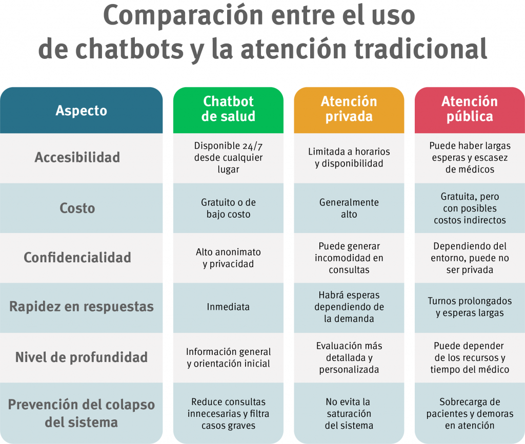Para comprender mejor las ventajas de los chatbots en la atención médica, se puede hacer una comparación entre su uso y la atención tradicional: