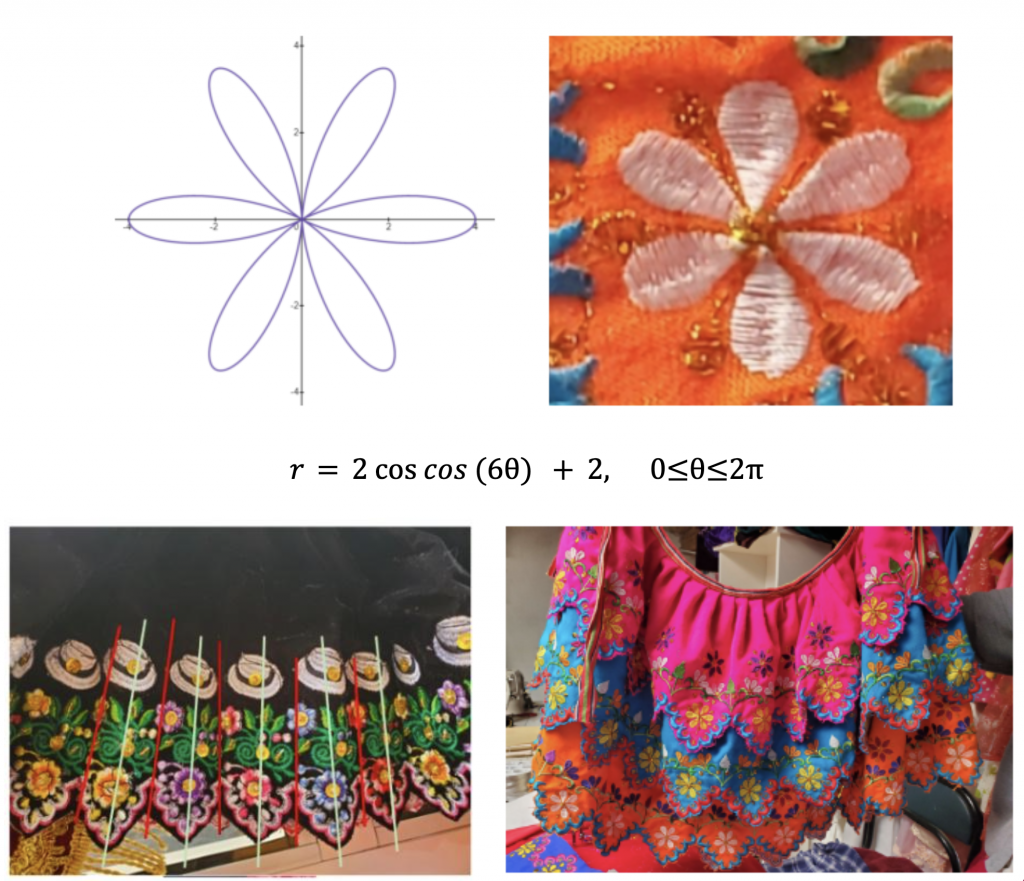 Un ejemplo de estas prácticas, la podemos encontrar en las artesanías como la confección y bordados de polleras, en donde se visibilizan operaciones matemáticas que van desde sumas hasta simetrías y modelación matemática.