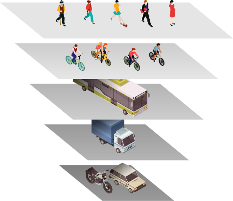 Durante las últimas dos décadas, los planificadores, gestores e investigadores han llegado a la conclusión de que para mejorar la movilidad de las ciudades se necesita un enfoque diferente. Basados en la idea de quienes necesitan movilizarse son las personas, se ha propuesto que el sistema de movilidad debe ofrecer medios más eficientes para los diferentes usuarios y motivos de viaje, usando el enfoque de la “pirámide invertida de movilidad”. Según este enfoque, la planificación de la movilidad urbana debe seguir un conjunto de prioridades: En primer lugar los modos “activos”, caminar o usar bicicleta para los desplazamientos cortos, y garantizar la accesibilidad para las personas que tienen algún impedimento. En segundo lugar se debe priorizar el transporte público y colectivo, garantizando la seguridad y confiabilidad. En tercer lugar planificar el transporte logístico para garantizar el abastecimiento y funcionamiento de bienes y servicios. Finalmente, el transporte vehículo particular que representa el segmento menos eficiente de la movilidad. Se ha demostrado que este enfoque tiene efectos positivos en la economía local, mejora la calidad de vida y previene enfermedades derivadas del sedentarismo.