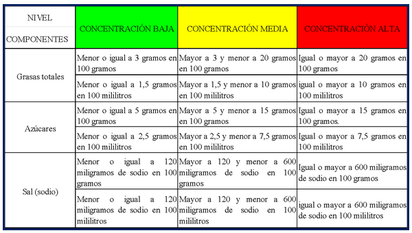 Desde el año 2014, en el Ecuador, se implementó el semáforo nutricional como una estrategia de salud pública para modificar la tendencia de la incidencia del exceso de peso en la población infantil ecuatoriana. El sistema gráfico consiste en tres barras de colores rojo que significa alto en, amarillo significa medio en y verde significa bajo en, colocadas de manera horizontal en el empaque del alimento. Estos colores indican la concentración de los componentes de azúcares, grasas y sal en 100 gr o 100 ml de acuerdo a las recomendaciones de la Organización Panamericana de la Salud (OPS)