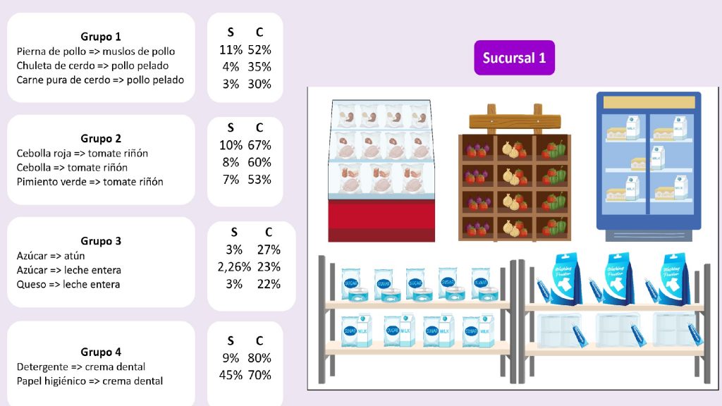 Por lo indicado en los párrafos anteriores, hay productos que son básicos y que deben estar juntos, lo que aporta a mejorar el tiempo de estadía en las tiendas y por supuesto permite encontrar lo necesario para el hogar. Además, las asociaciones de productos obtenidos en cada regla permiten que el minorista tenga una idea general de la redistribución que se debe hacer en cada percha, congelador o mostrador y así facilitar la comprensión de cada cambio a realizarse.