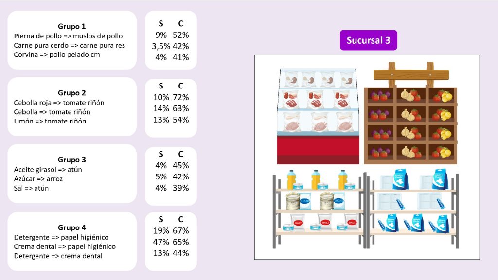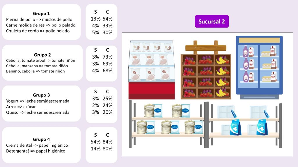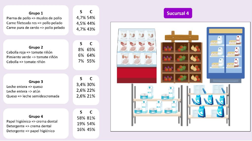 En el primer grupo de las 4 sucursales, se observa que la regla más fuerte en los cuatro casos es la que demuestra que cuando se compra piernas de pollo, es seguro que se compra muslos de pollo, con una confianza de 52%, 54%, 52% y 54%, respectivamente. Por lo tanto, para garantizar que el cliente ahorre tiempo en su compra, el minorista se asegurará que las piernas y muslos de pollo se encuentren colocados en lugares cercanos en el refrigerador, o que, a su vez, se elaboren paquetes que contengan estos dos productos. Al analizar al segundo grupo de las 4 sucursales, la regla más fuerte en 3 de los 4 casos es la asegura que cuando se compra cebolla roja, se compra también tomate riñón, con una confianza de 67%, 72% y 65 %, respectivamente. Para el segundo grupo se obtuvo la regla de asociación con un 73% de confianza, que indica que la cebolla y el tomate de árbol se compran en conjunto con el tomate riñón. Entonces, el minorista distribuirá el espacio de tal manera que el tomate riñón y la cebolla se ubiquen en espacios cercanos, para así garantizar una compra menos tediosa y mucho más rápida.