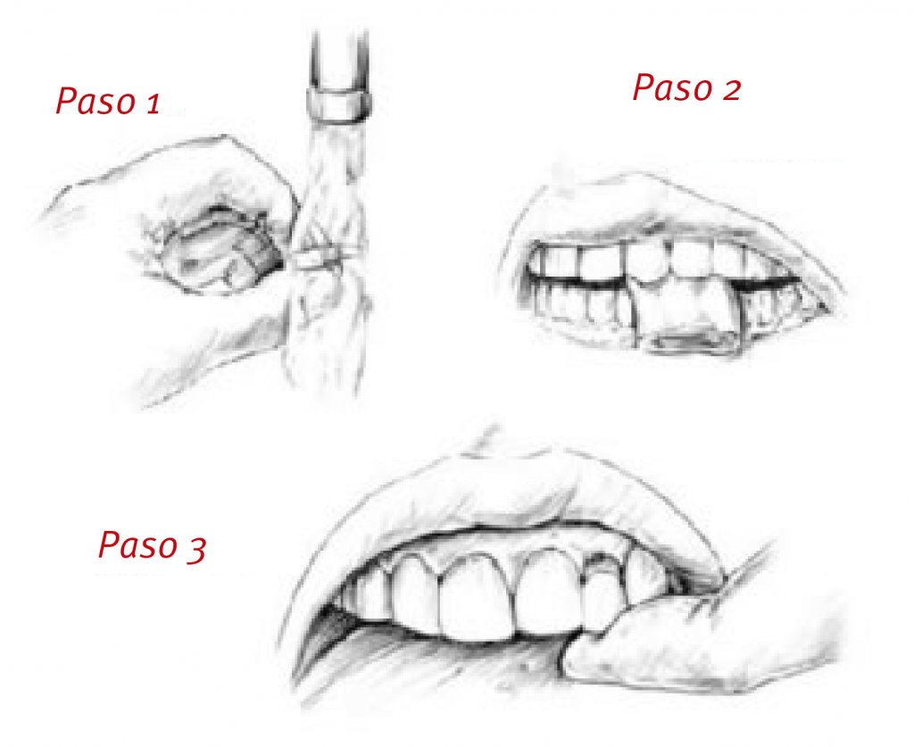 3.- Dado el paso anterior, el paciente debe morder una gasa, pañuelo o servilleta para mantenerlo en su lugar, hasta llegar a la consulta odontológica.