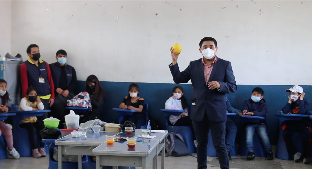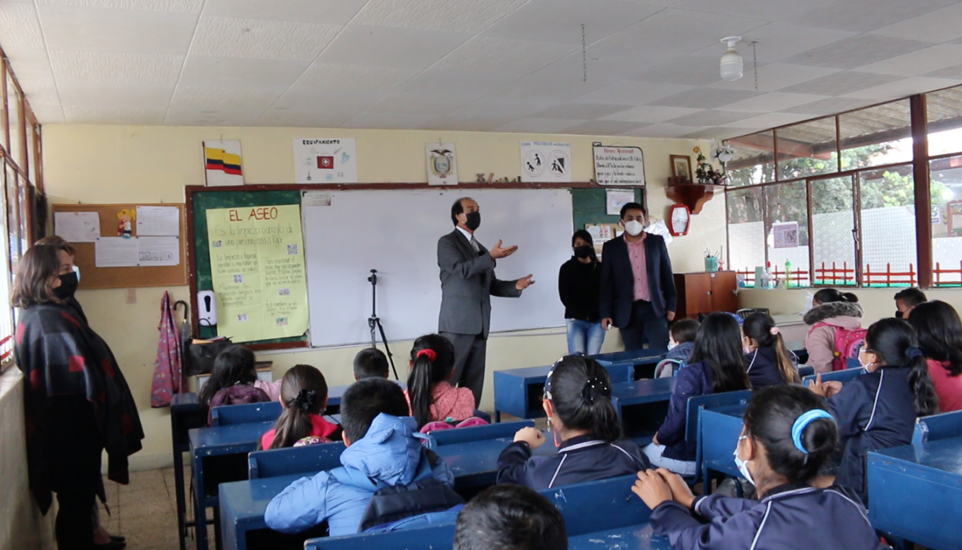 El investigador David Tacuri de la Universidad de Cuenca, motiva la participación de los estudiantes de la escuela Remigio Romero y Cordero en el proyecto investigación de lectura e inteligencia emocional. Foto: Evelin Valdivieso