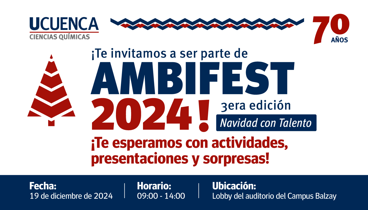La Facultad de Ciencias Químicas de la Universidad de Cuenca, invita a participar en Ambifest 2024: Navidad con Talento, un evento que celebra el espíritu navideño y los 70 años de vida institucional de nuestra Facultad.