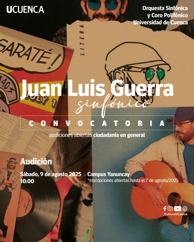Te invitamos a participar en nuestra próxima producción musical: “Juan Luis Guerra Sinfónico”, junto a la Orquesta Sinfónica y el Coro Polifónico de la Universidad de Cuenca.