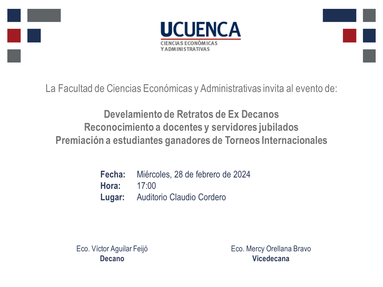 Finalmente, se realizará el Develamiento de los retratos de Ex Decanos de la Facultad, Eco. Rodrigo Mendieta Muñoz (abril 2016 – diciembre 2019) e Ing. Jorge Campoverde Campoverde (marzo 2020 – diciembre 2021).
