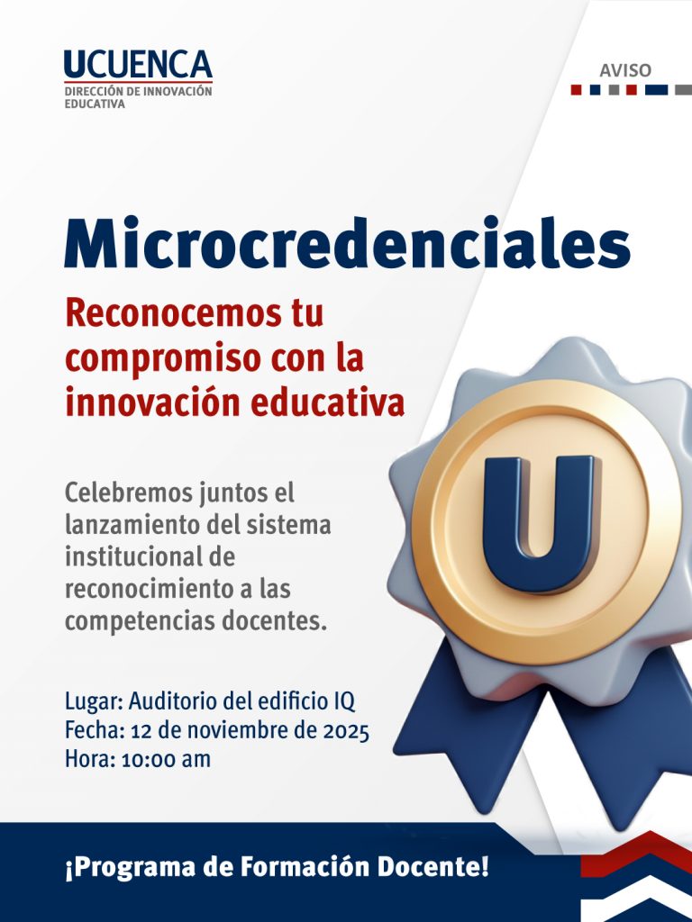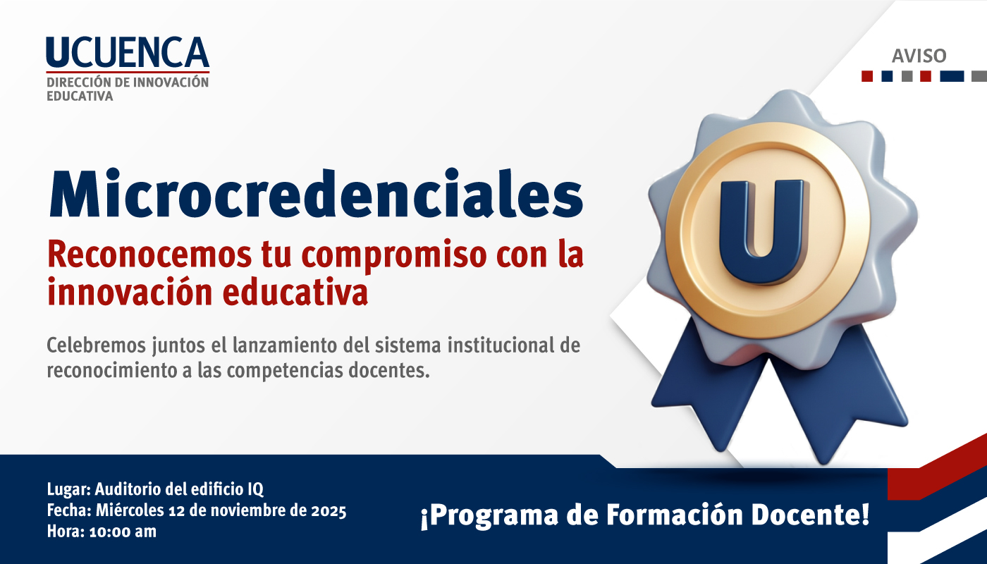 La Universidad de Cuenca realizará este miércoles 12 de noviembre de 2025, a las 10:00 a. m. en el Auditorio del edificio IQ, la emisión en vivo de las primeras 150 microcredenciales digitales para docentes de la institución, marcando un hito en la innovación educativa del país.