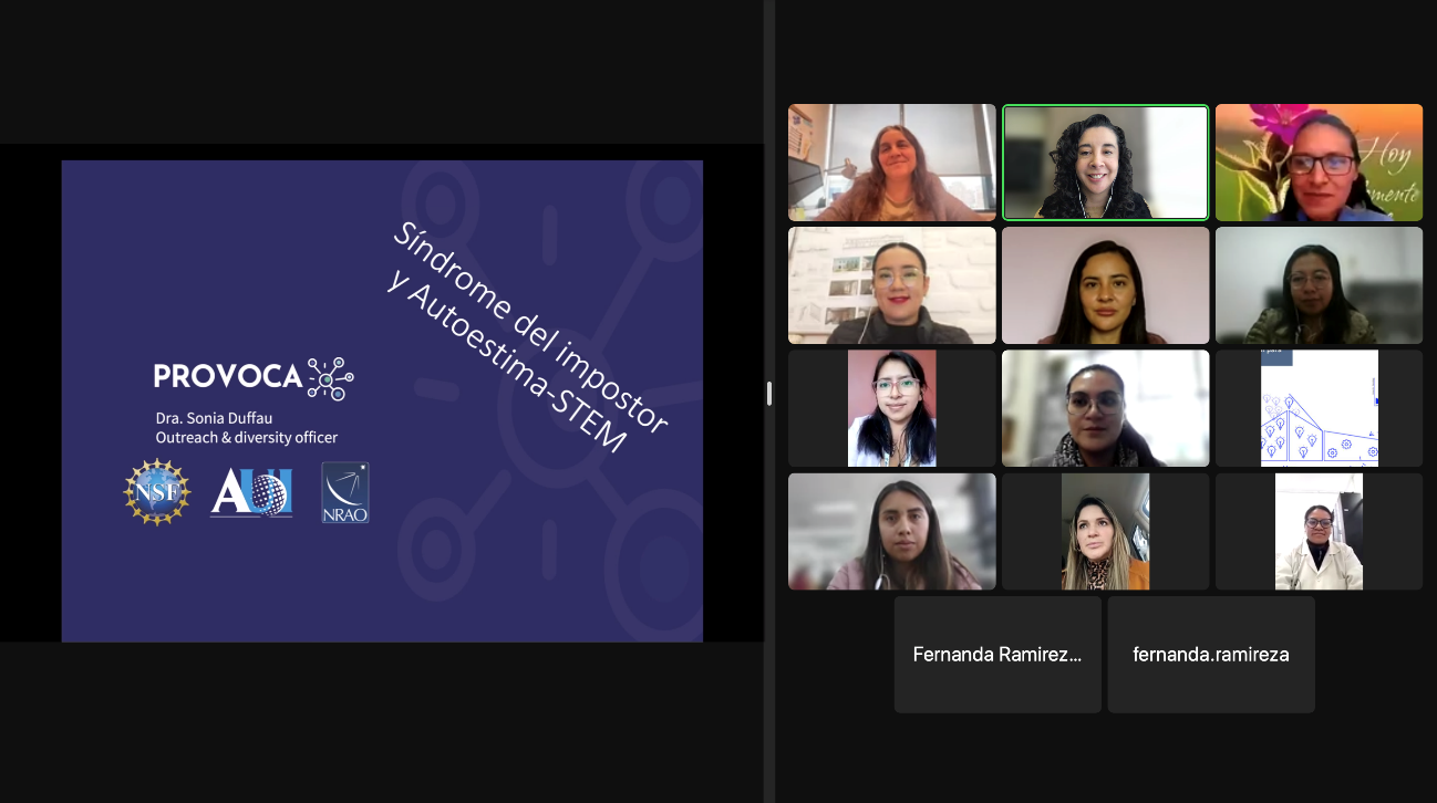 Esta y otras preguntas se debatieron en el Segundo Taller virtual para las participantes del III Cohorte del Programa de Mentoría para Mujeres Científicas de la Universidad de Cuenca -PROMEMCI- en los que se abordó las temáticas: Síndrome del Impostor y autoestima STEM, a cargo de Sonia Duffau oficial de Divulgación y Diversidad para Associated Universities, Inc (AIU) y el observatorio radioastronómico de los EE.UU. (NRAO) y que lleva adelante la iniciativa (PROmovamos VOCAciones científicas) -PROVOCA- de Chile.