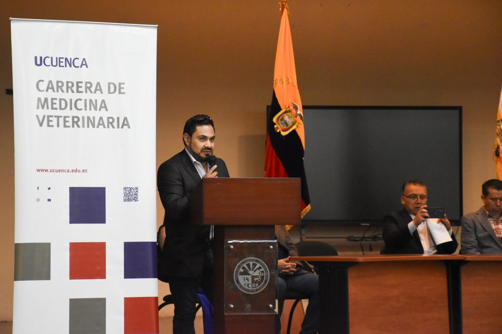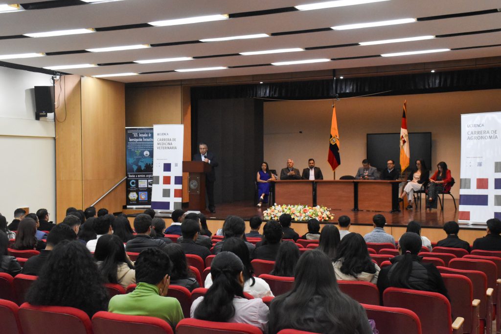 Por su parte, el subdecano de la Facultad de Ciencias Agropecuarias, Eduardo Tacuri Espinoza, dio la bienvenida a los asistentes y resaltó que este tipo de espacios fomentan la curiosidad intelectual, señalando que la investigación se construye desde el aula, los campos de cultivo y los laboratorios. En este sentido, subrayó que la formación investigativa es clave para que carreras como Medicina Veterinaria y Agronomía aporten al futuro de la prosperidad humana. Finalmente, agradeció la presencia de docentes y estudiantes, así como la asistencia de estudiantes de niveles iniciales, quienes se sumaron activamente a estas jornadas académicas.