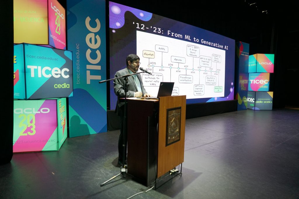 Xavier Ochoa, docente de la Universidad de Nueva York, abordó el tema «Analítica del Aprendizaje e IA: Oportunidades y Peligros», abordó diversas formas en que los modelos generativos, ya sea en texto, imágenes o audio, pueden ser utilizados para crear herramientas de analítica del aprendizaje.