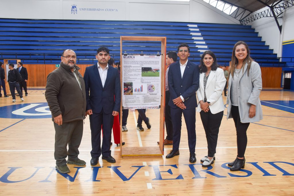 Jorge Barreto Andrade,Director de EDFIDYS, estudiantes de octavo ciclo, Monserrath Jerves, Vicerrectora de Investigacion e Innovación y Anita Delgado, Directora de Carrera  de Pedagogía de la Actividad Física y Deporte.