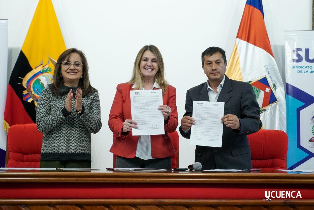 La Universidad de Cuenca y el Sindicato Único de Trabajadores de la Universidad de Cuenca (SUTUC) suscribieron un Convenio Específico de Cooperación Interinstitucional orientado a fortalecer la formación y el desarrollo profesional de los trabajadores de la institución.