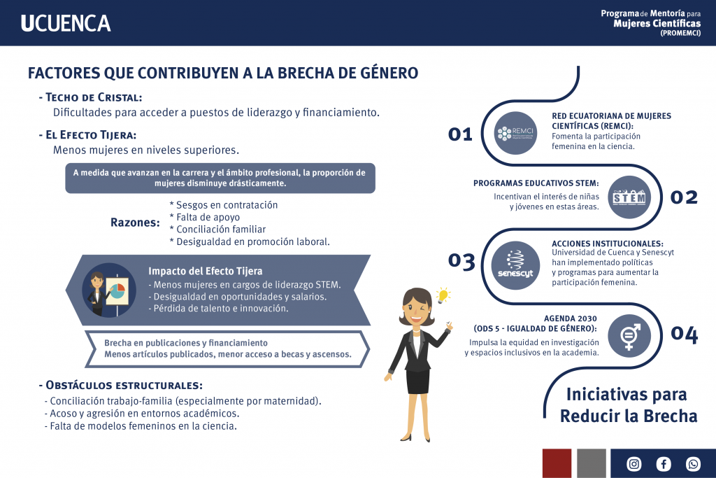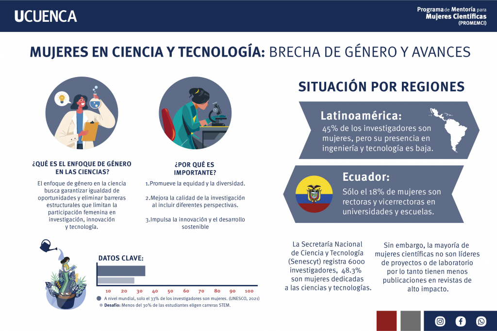 La participación femenina en ciencia y tecnología sigue siendo baja. A nivel mundial, solo el 33% de los investigadores son mujeres, y menos del 30% elige carreras STEM (UNESCO, 2021). En Ecuador, aunque el 48.3% de los investigadores son mujeres (El Comercio, 2023), solo el 19% trabaja en ingeniería y tecnología (Ruano & Guerrero, 2024) . Esta brecha de género se debe a factores como el «techo de cristal», la conciliación familiar-laboral, el acoso en entornos académicos y la escasez de referentes femeninos (Universidad de Cuenca, 2019).